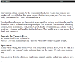 Beneath the Tunnels Deep has had a few different re-tellings at this point. It started as an entry for Fuck This Jam, then became part of an experiment I did in writing a text parser, and finally has arrived at its latest — and last — incarnation as an IF game. It’s also, from the graphical to each new version of text adventure, changed each time. The graphical version is rather, at least I think, whimsical and bizarre. This version, well, it’s a great deal darker and borders on a horror story in places.