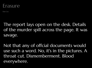 Erasure is the result of me wanting to write more detective stories. Several years ago, I wanted to be a novelist and I used to write what were essentially detective stories set in science fiction and fantasy settings. A crime would happen and the character would come in and try to figure out what happened. That isn’t what is going in in this story though. It’s realism with a dash of ideas from The Killing.