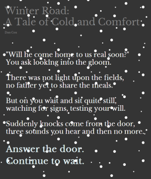 Winter Road remains my favorite. It was the first story I wrote and remains the one I have spent the most time on overall. It took me several days of writing to make sure I got all the rhyming correct. Even now, I like to repeat the first few lines to myself because I enjoy their sounds and pattern.