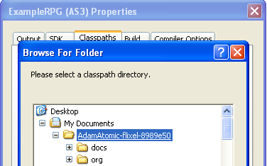 To add the Flixel library, we want the parent folder containing both the “org” and “docs” folders.