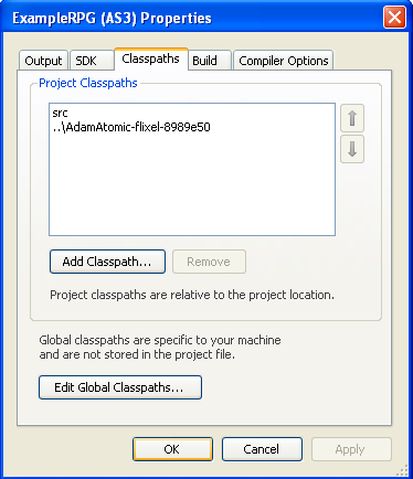 Clicking “OK” will now show the relative path to the Flixel files in the Classpaths tab.