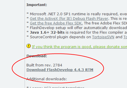 Clicking on it will send you to the Flash Develop forum page for the current version. You will need to scroll down the page some until you see the section labeled “Download” with the link to the current build.