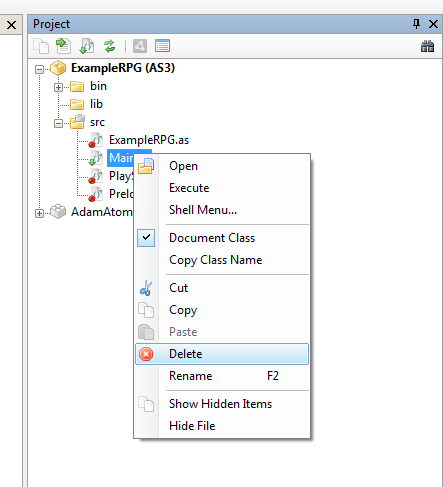So, in order to delete “Main.as”, select it, right-click to bring up the context menu and select Delete.