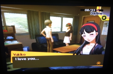In the episode, it was used as a little bit of dig against Pete but, for me, it became personal as the talk on the phrase happened around the same time as the above screenshot. Yukkio had confessed her love for ‘the protagonist’ and, in classic “gamer” fashion, I was experiencing a deeper false intimacy than I had at the time. Here I was at, I think, around 5 AM some time playing a game where relationships are reduced to short sequences and numbers. Yet, I was personally angry at the ability of ‘the protagonist’ to progress so many complex relationships between people, including this romantic one, while I hadn’t communicated with another person for upwards of eight hours, and haven’t spoken to more than a couple of people for the last several days.