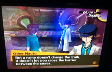 And even with all this other mess, what I found most damning was the “male” tone used by Naoto in the game. The word choices are masculine in nature, purposely playing up, the game wants to point out, the overcompensating nature of Naoto’s life. His logic comes from his masculine side. In order to think clearly, he must reject all touches of femininity and lose all connection to emotion.