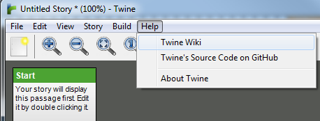 The Help top-level menu’s contents links to Twine resources. The first, Twine Wiki, links out to the wiki itself. The “Twine’s Source Code on Github” option is exactly that, a link to the GitHub page, providing a way to report issues, bugs, and even suggest future functionality.