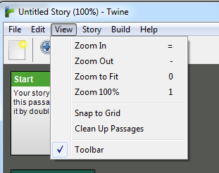 The Story top-level menu is where the most changes have appeared in Twine 1.4. Unlike previous versions, you can now create a specific type of Passage, delete one, or add things like fonts and images directly. You can even create the various Special Passages without having to know or reference their names now. And, of course, Story Formats can be changed.