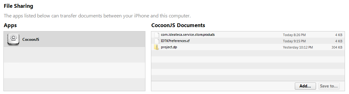 Once a file is selected, it will show up under the “CocoonJS Documents” section under File Sharing and also be transferred to the iOS device.