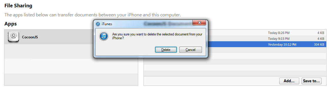 (You will have to go through these three steps, selecting the file, pressing Delete, and confirming, for every single file every time in iTunes. The CocoonJS App does not have the ability to edit files, merely read and run them.)