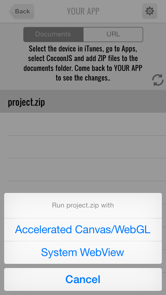The “Add” window allows you to select the zipped project file you would like to test on the device using CocoonJS. (Remember that you need to use ZIP files only. Before each test, zip together all your files, including all JavaScript libraries and assets, as one file.)