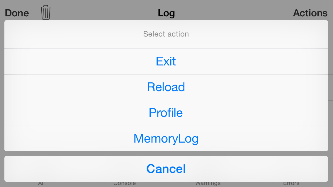 Tapping on the “Actions” button will open that menu. From here, you can Reload, record a Profile and view the MemoryLog. You can also tap on ‘Exit’ to close the testing of this project and return to the contents listing of ‘Documents’.