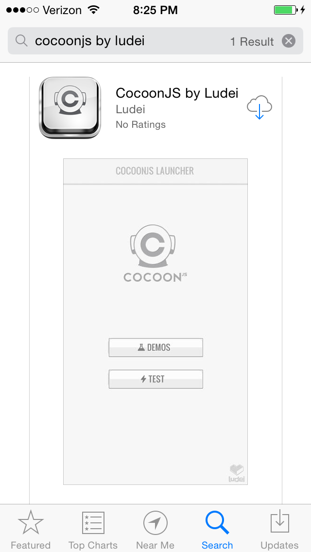 Search for “cocoonjs by ludei” to find the “CocoonJS by Ludei” app. (The app is free.)