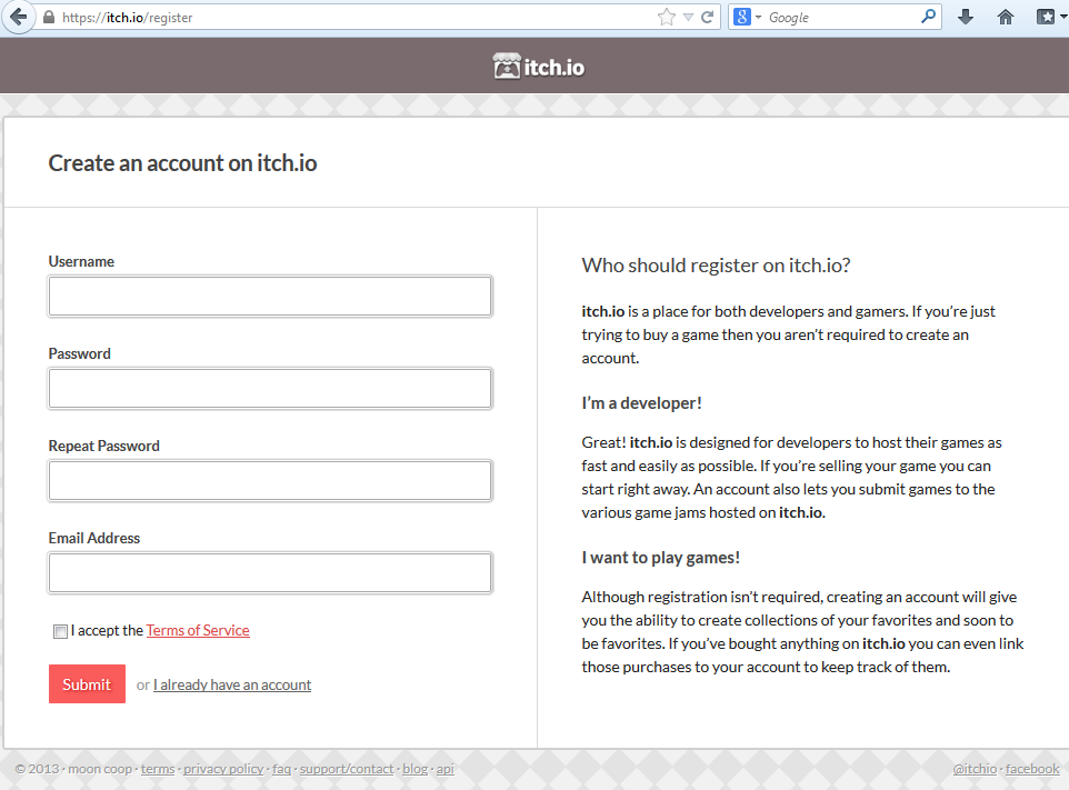 itch.io is an exciting new service that aspires to be “a simple way to find, download and distribute indie games online.” By offering different options for developers to sell their projects, or even just host them with an integrated donation button connected to other services like PayPal and Amazon Payments, it stands apart from many other storefronts and services by being free to register and use. No up-front costs or credit card needed. Just file hosting and a support system to help indie games gain exposure and receive support.
