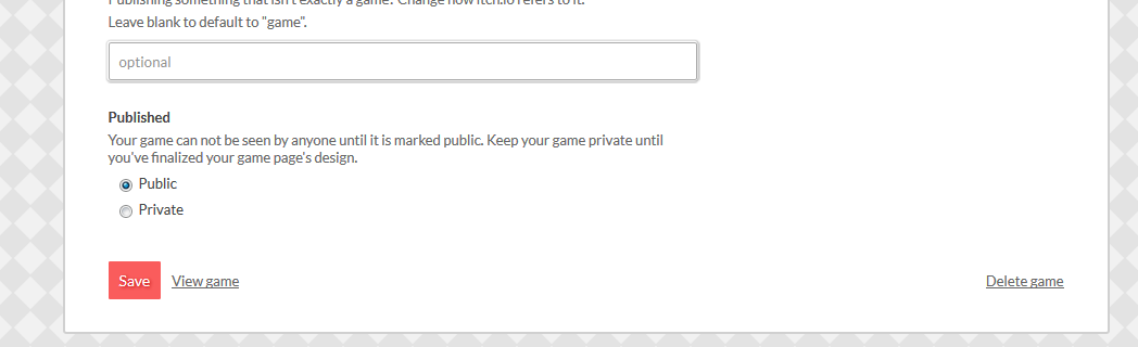 Privately viewing a game hosted on itch.io gives you the chance to do some final testing before making your game public. ‘Playing’ through it using this setting will give you a feel for how others might see in their own browsers.