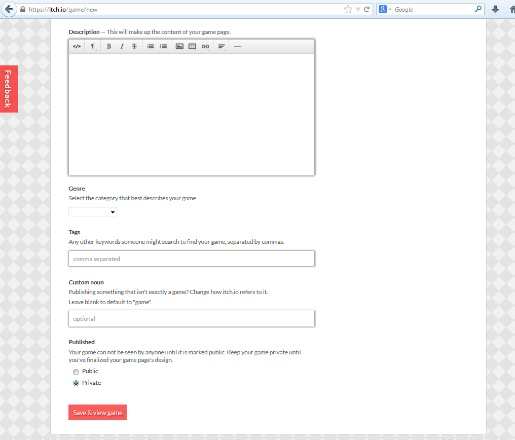 Once you have your ZIP file uploaded, you can write a description of the project and select its associated genre. You can also include comma separated tags for how someone might search for your game.