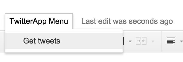 Now, you should see the “TwitterApp Menu” menu and, after clicking on it, the “Get tweets” option. Clicking on this will run the readTweets function and collect tweets using the configuration rules within that function.