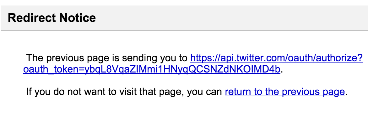 Because we set a Callback URL in our Setting for creating the Twitter App, Google Scripts will let us know that a redirect was in progress. Click on the link to Twitter.