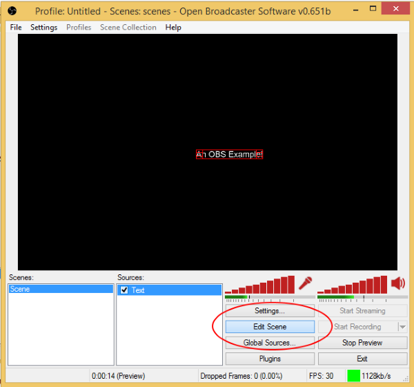 Once in Preview, you can click on the “Edit Scene” button to move sources around on the screen. Each source within the Editing mode of Preview will have a red box around it and can be re-sized or dragged into the position wanted.