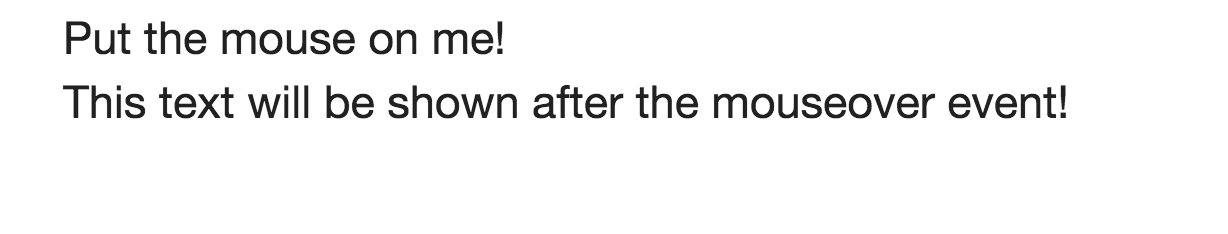 | $(".replaceMe").text("This text will be shown after the mouseover event!"); | |