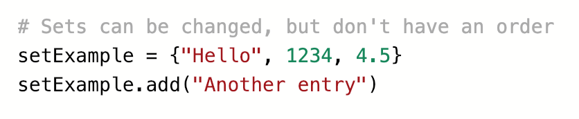 In Python, a Set is an unordered collection of data. Unlike Lists, items within a Set cannot be accessed through their position. However, unlike Tuples, Sets can be changed. Items can be added, changed, and removed.