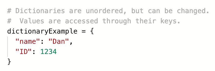 Dictionaries can be thought of a special kind of Set. Unlike a series of data, entries are stored as key-value pairs. For whatever the key is, the value is returned.