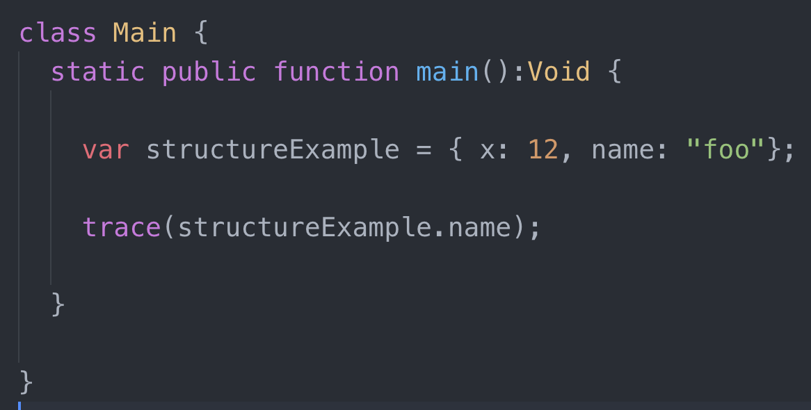 Haxe supports anonymous structures. Sometimes called object literals in other programming languages, an anonymous structure allows for defining an object-like data formation.