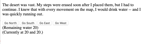 | The desert was vast. My steps were erased soon after I placed them, but I had to continue. I knew that with every movement on the map, I would drink water — and I was quickly running out. | |