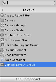 This time, choose Layout -> Vertical Layout Group. This will serve, as new elements are added, to create a row-like structure.