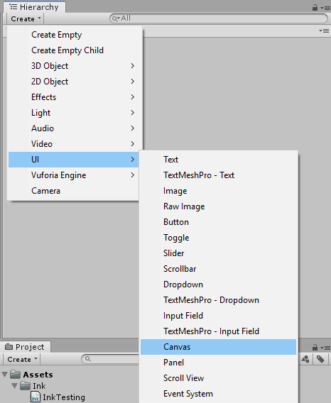 Select “Scripts” and then the Ink Example file. This will associate the file with the Canvas object.