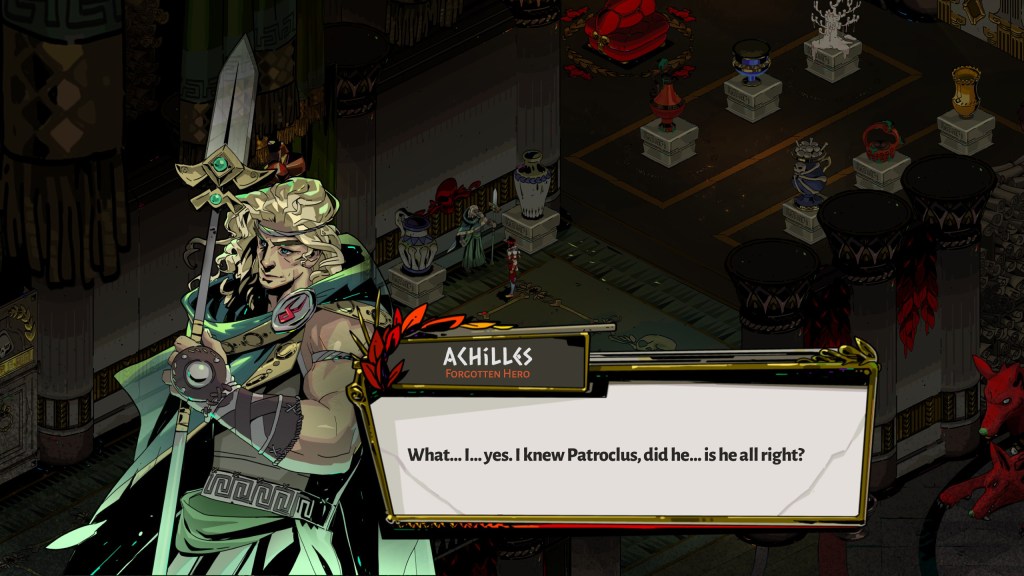 Achilles is a recurring character found initially off to the side. Upon talking to him across runs, he reveals a bargain he made and some unfinished business with another character, Patroclus.
