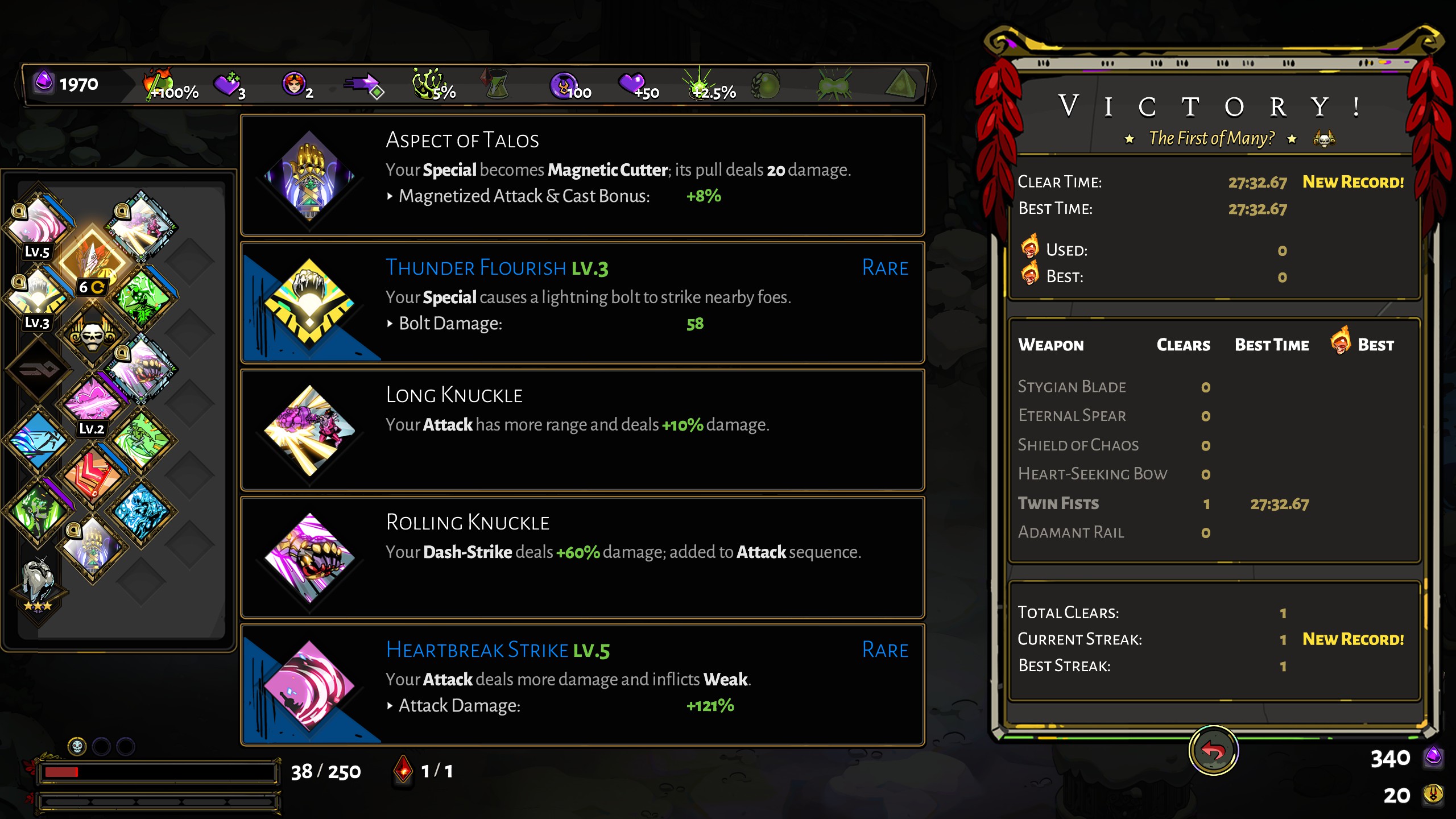 Hades cares about statistics. Every successful run shows the total time, how many clears have been accomplished using other weapons, and each of their own best times. It also shows all boons collected.