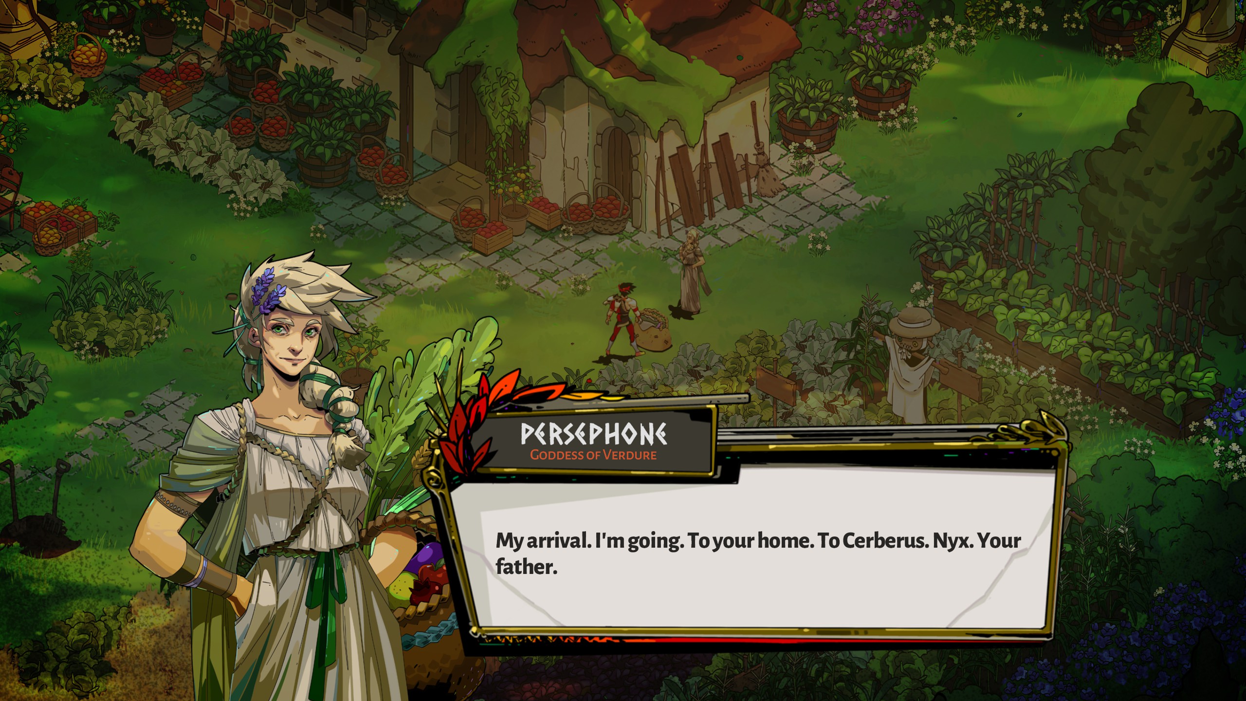 Fighting his way through the security of the Underworld, dying but growing in strength through each experience, he reaches her in her garden. Persephone, learning her son is not truly dead, is shocked, but no more so than Zagreus. Being born as a part of the Underworld comes with a price: leave its domain for too long and you die again, returning to it.