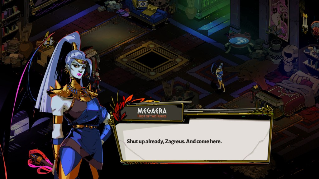 Megaera, at first a boss enemy and then possible love interest after killing her many times, slowly opens (back) up to Zagreus about their previous relationship and a new, possible future together.