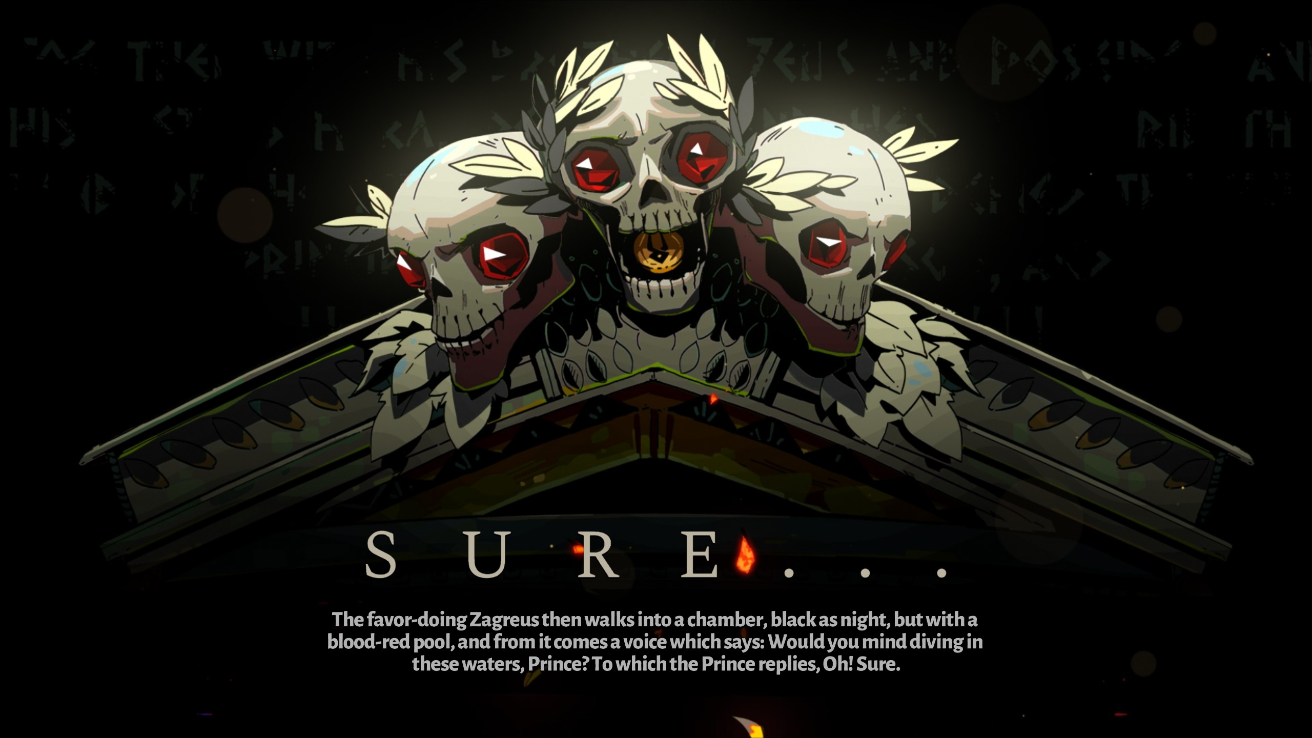 Each character only gives Zagreus a handful of text per run. This means there is always new things to see, more information to learn, but the pace is tied to the player’s. To learn, you must first fail.
