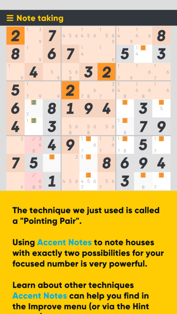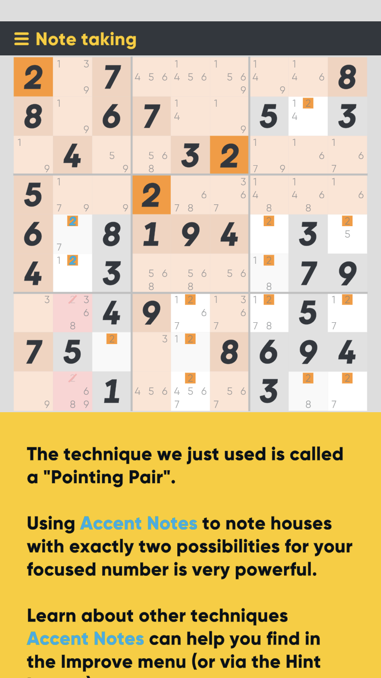 The player is even awarded achievements when they accomplish certain advanced techniques a certain number of times demonstrating their mastery of them. This is Good Sudoku reinforcing its learning. It assumes the player no longer needs the same explicit support structures once they have proved they understand how to solve particular patterns.