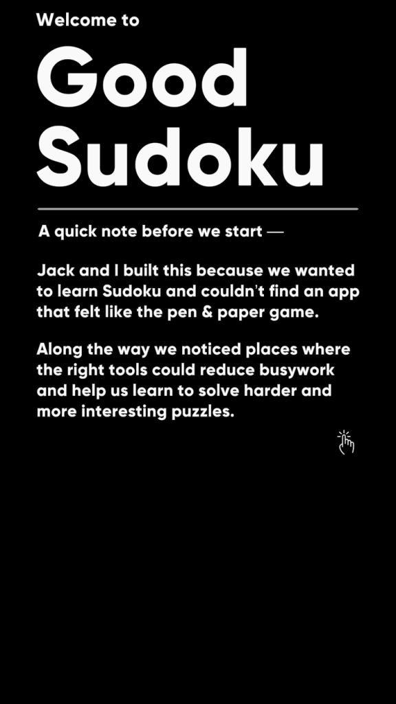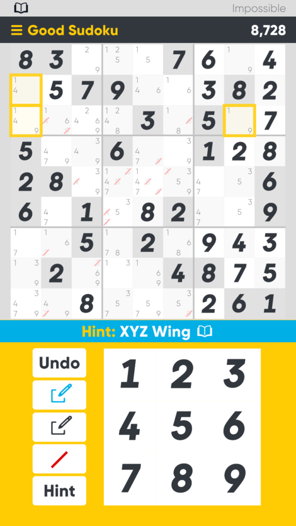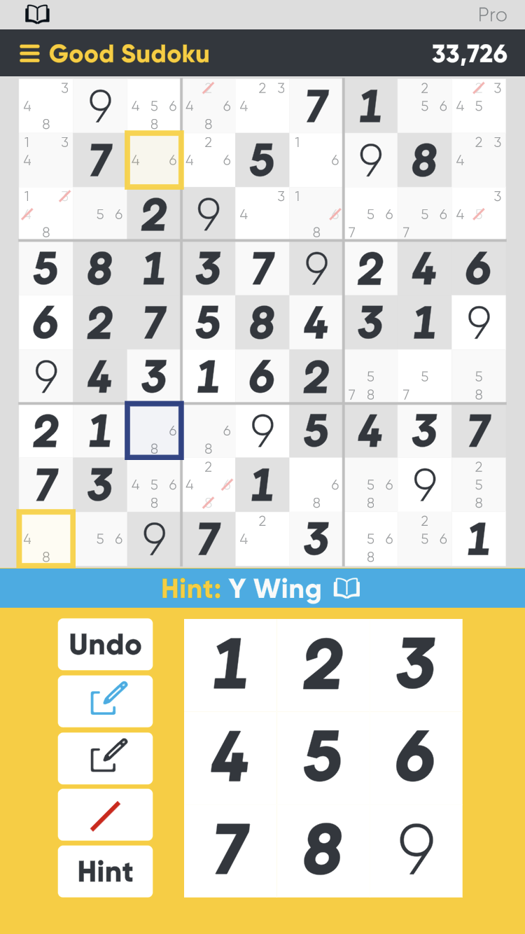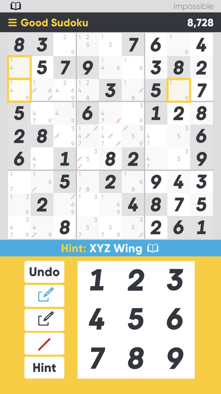 The application Good Sudoku opens with an introduction promising to “reduce busywork” and help teach people to “solve harder and more interesting puzzles.” Instead of, as with hundreds of other collections, simply providing the puzzles in different categories, the purpose of Good Sudoku is pedagogical. It provides the tools for the player to become “good” at Sudoku through explaining its rules and common patterns as a result of its rules.