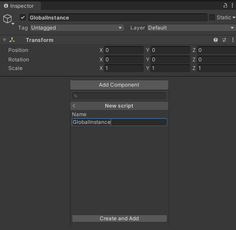 Add a new Scripting Component. Name the file and class GlobalInstance. (While technically the class and GameObjectc an have different names, it is recommended to match them for easier understand of what they do at a glance.)