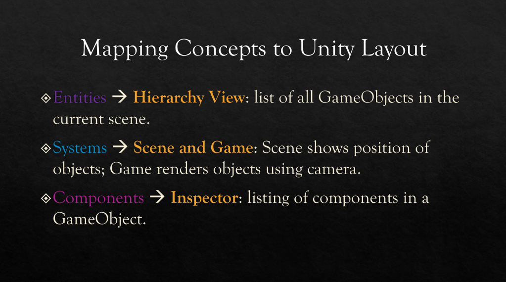 - Entity: GameObject. Examples include Camera, Sprite, Text, and AudioSource. Anything that can be added to a Scene using the Hierarchy View is an entity.