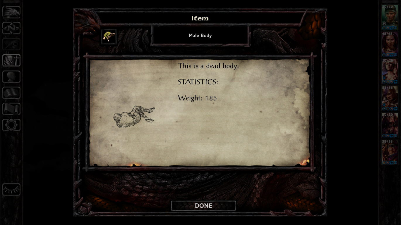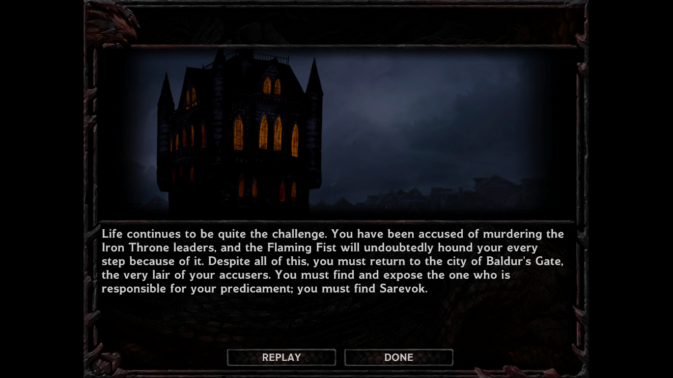 The wiki says there are 54 named locations in Baldur’s Gate (1998). I saw, I think, maybe a third of them during my fairly quick play-through using Story Mode. (My total time was around nine hours out of what is advertised as “75+ hours of content.”) As I wandered around in often large areas, I would slowly see more of the map. As the screenshot above shows, you can only “see” parts that your party has explored. Yet, in re-creating what was no doubt a remediation of a party of players exploring parts of a table-top map when playing Dungeons & Dragons together, I kept getting frustrated when trying to find things. I would often have to clear most of a map to find the one person or thing I needed to see, kill, or get before then telling my party to run to the edge of the screen in order to get back to the World Map.