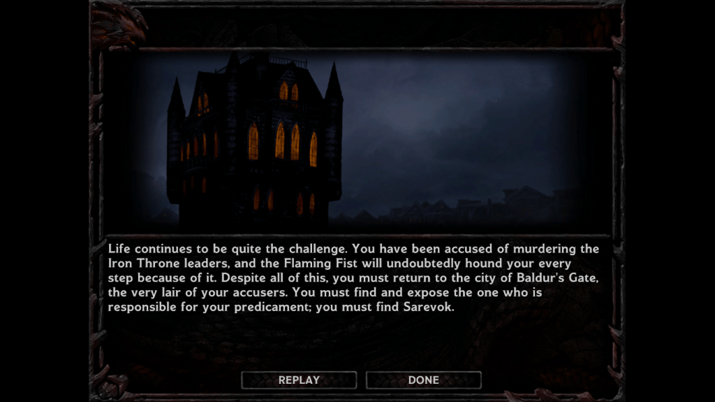 Many of the locations, and the sewers in the city of Baldur’s Gate are a great example, are very hard to navigate. The isomorphic view means that parts of doors, walls, and even walkways are hard to see and the player sometimes needs to move the cursor around to find the exact spot to click next to direct the party to move to next. (The Thief’s Maze at the end of the game is extremely annoying in that regard.) Combined with needing to “explore” in order to find doors, I lost much more time than I liked simply walking around trying to find where to go next. The occasional fight broke up this up, but of all of the improvements found in games following in this model, I am glad that navigating tight hallways is mostly gone from the genre.