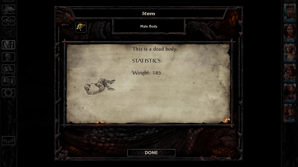 During a quest in the city of Baldur’s Gate, I ventured into the sewers of the city. Navigating the tight spaces, I came across multiple dead bodies and various creatures feasting on them. Upon clicking on the bodies in a few places, a theme quickly developed: all of the corpses are male. In fact, in anther unusual moment in the game, the party can, in fact, pick up and walk around with “Male Body,” one of many items to be found in the piles. Continuing through the sewers leads to another location past all the piles of bodies: the Underceller.