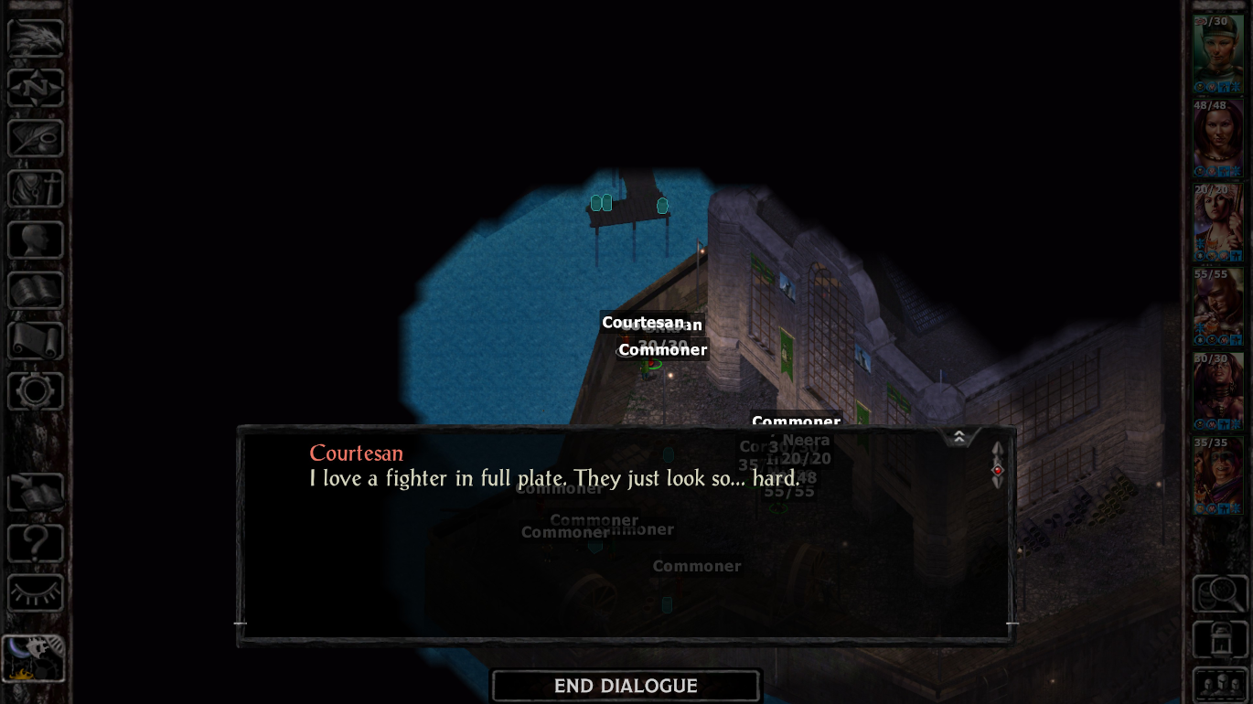 The Underceller is a brothel of sorts under the city of Baldur’s Gate. I note “of sorts,” because it caters to a very specific audience: heterosexual men. Now, of course, queer women and nonbinary pals may find the women attractive, but in the Underceller all of the women — and they are all women — are only in their rooms with Noblemen, the generic title for non-player characters. In fact, in exploring around the docks of Baldur’s Gate, the player may run into other “Courtesan” characters as well. All of them, well, the screenshot above gives a great example: they speak in inuendo.