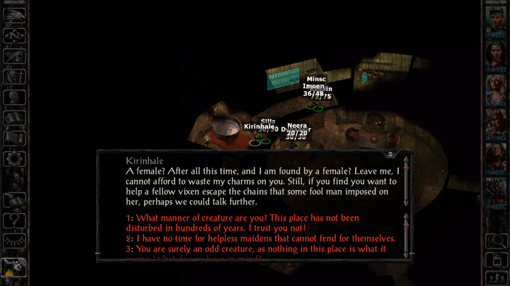 There is a succubus in Durlag’s Tower. Upon meeting her, when playing as a woman in Baldur’s Gate (1998), some dialogue gets changed. Kirinhale, the succubus, replies in part: “A female? After all this time, and I am found by a female? Leave me, I cannot afford to waste my charms on you.” As the game goes out of its way to point out in this dialogue, a succubus cannot tempt a woman. After all, charms would be wasted. It’s not like women, trans men, and nonbinary people can find women attractive. That’s only for cis-het men, right?