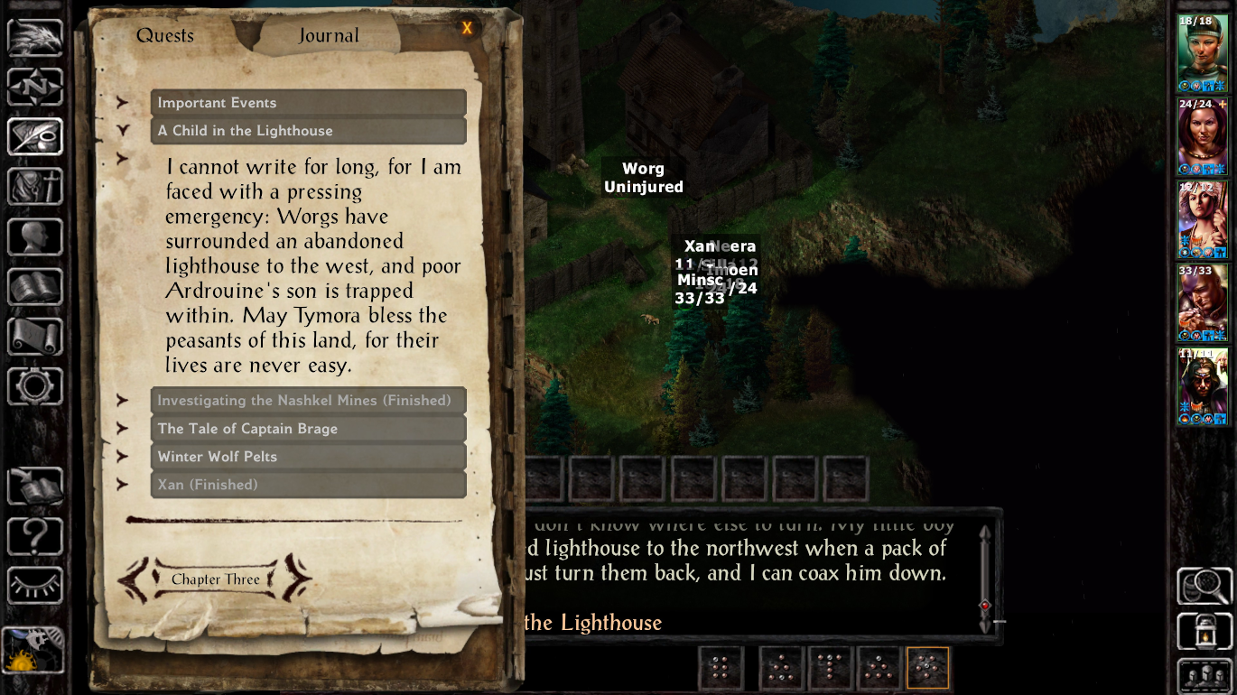 “I cannot write for long, for I am faced with a pressing emergency…” starts one of the stranger moments of Baldur’s Gate (1998). The Quest log, labelled “Journal” in the game, keeps track of events and helps the player, to some degree, to know what they have done and where to go next. As events unfold, it updates and keeps a “journal,” with timestamps using the in-game day and time, to log when things happen. As part of the log, it uses a curious pronoun: “I.”