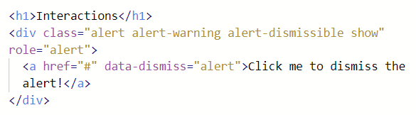 To make an Alert have an interactive aspect, an additional class alert-dismissible must be added to the element. Elements with the