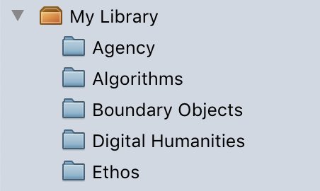 A Library can have one or more collections. As “folders,” these help a user organize the items in better ways. Depending on the user, it might be more helpful to organize around themes, courses, topics, or other categories. Collections are purposefully left vague in Zotero to empower the user to find a way that best helps them organize their thoughts, items, and the relationships between them.