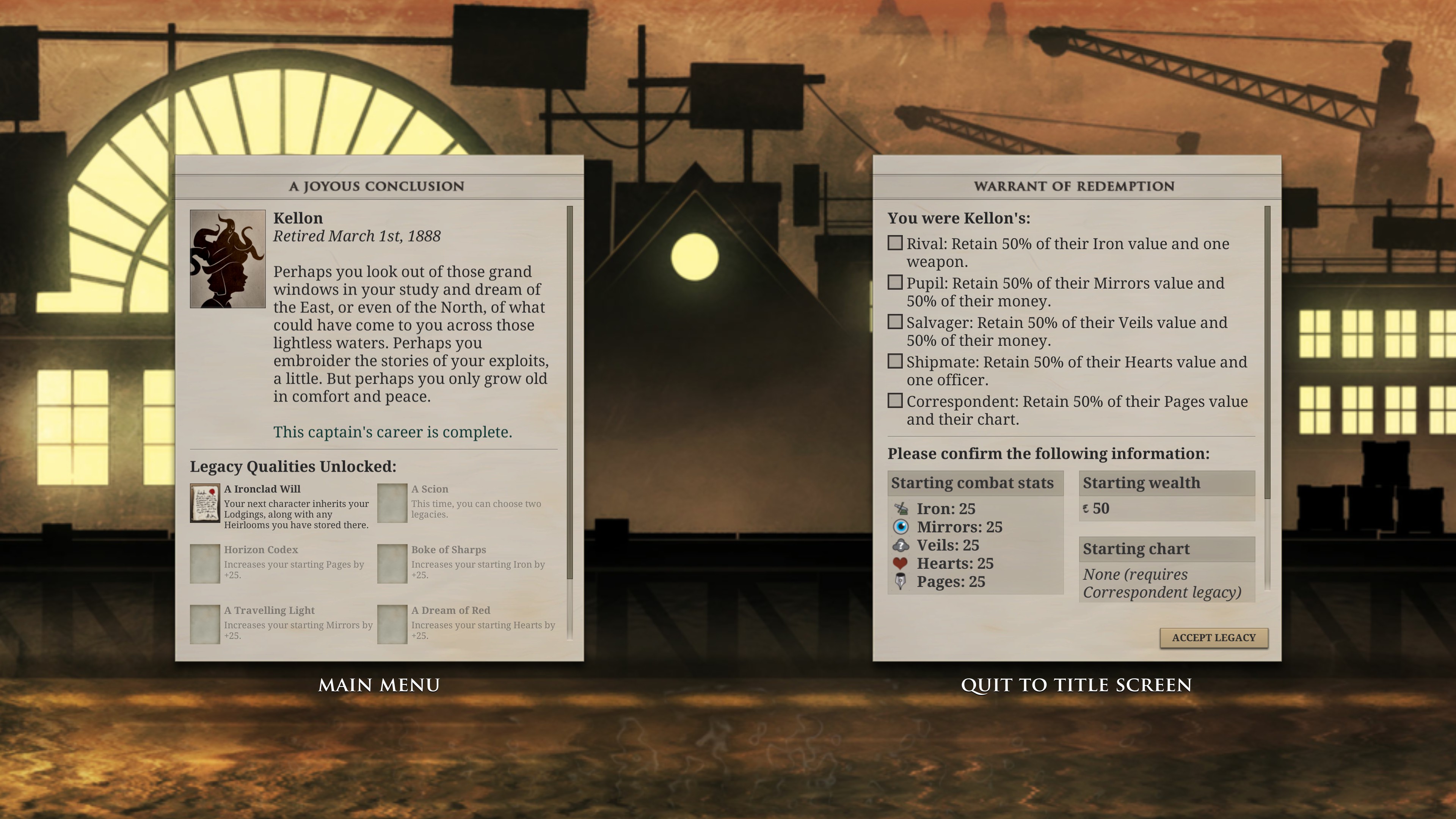 Sunless Sea (2015) starts with an explicit question and invites the player to try to answer an implicit one. “Who were you?” asks the game as the player starts a new life. Tied up into this question, and left to the player to discover based on random chance and knowledge of its world, is the implicit question asked at the start of each new life on the Zee: “And who do you want to be?” The backgrounds available to the player set a range of possible paths through their new life as a zee-captain, but this does not dictate everything. A player can, with enough knowledge of its systems and some good luck, be and do just about anything.