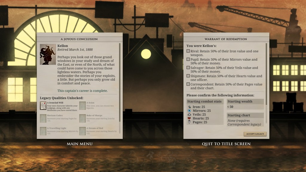 The very optimization the game encourages becomes its downfall. The long line of unrelenting death the player creates drags them through a hell of their own making. Sacrificing a current life and its relationships becomes an increasingly viable strategy to creating better, future lives. Selling everything seems the only rational solution while clinging to a hope of making it to retirement and passing anything on to the next generation. No cost seems to too great if there are no long-term consequences beyond some slight hope. This becomes a systematic torture as a well-constructed life can end if the risks of a good-seeming gamble to explore or battle with a creature game can figurative — and literally — sink the life of zee-captain. If everything, including the death of the player-character, is a currency to be spent, there is no end to spending, no bottom to be reached. Spend. Die. Repeat. Sail again. Sail forever.