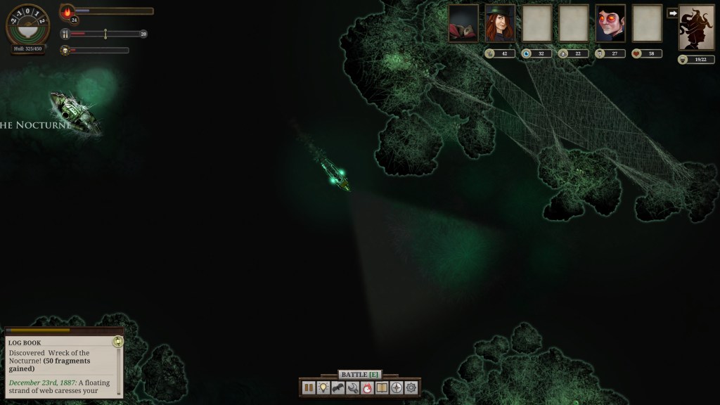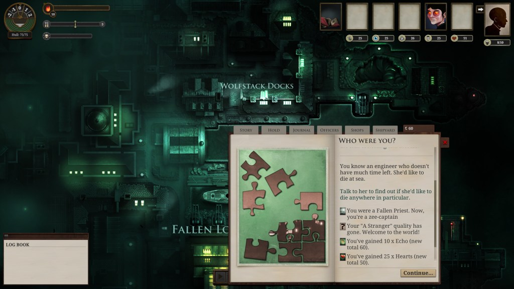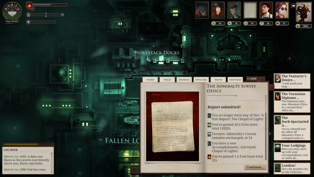 Selecting options from the in-game journal when visiting locations shows the requirements — and often cost — of qualities to experience the content. Visiting a new island may generate a Port Report, for example, which can be exchanged for other goods back in the docks of Fallen London. Buying fuel decreases the amount of Echoes. Sailing and finding new places generates Fragments. Even knowledge itself becomes something sold to others. An experience of visiting the surface and its own cities becomes something to be bought and sold. Everything in Sunless Sea (2015) becomes something tracked, which gives it a value within the markets of the game. Even the crew of the ship can be exchanged for other things such as selling them into slavery for Echoes or consuming them as food when nothing else is available.