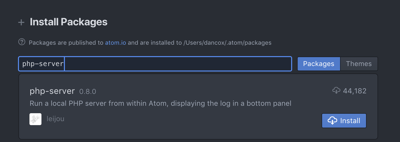 In the search bar, type in “php-server” and click its “Install” button once the php-server package has been found.